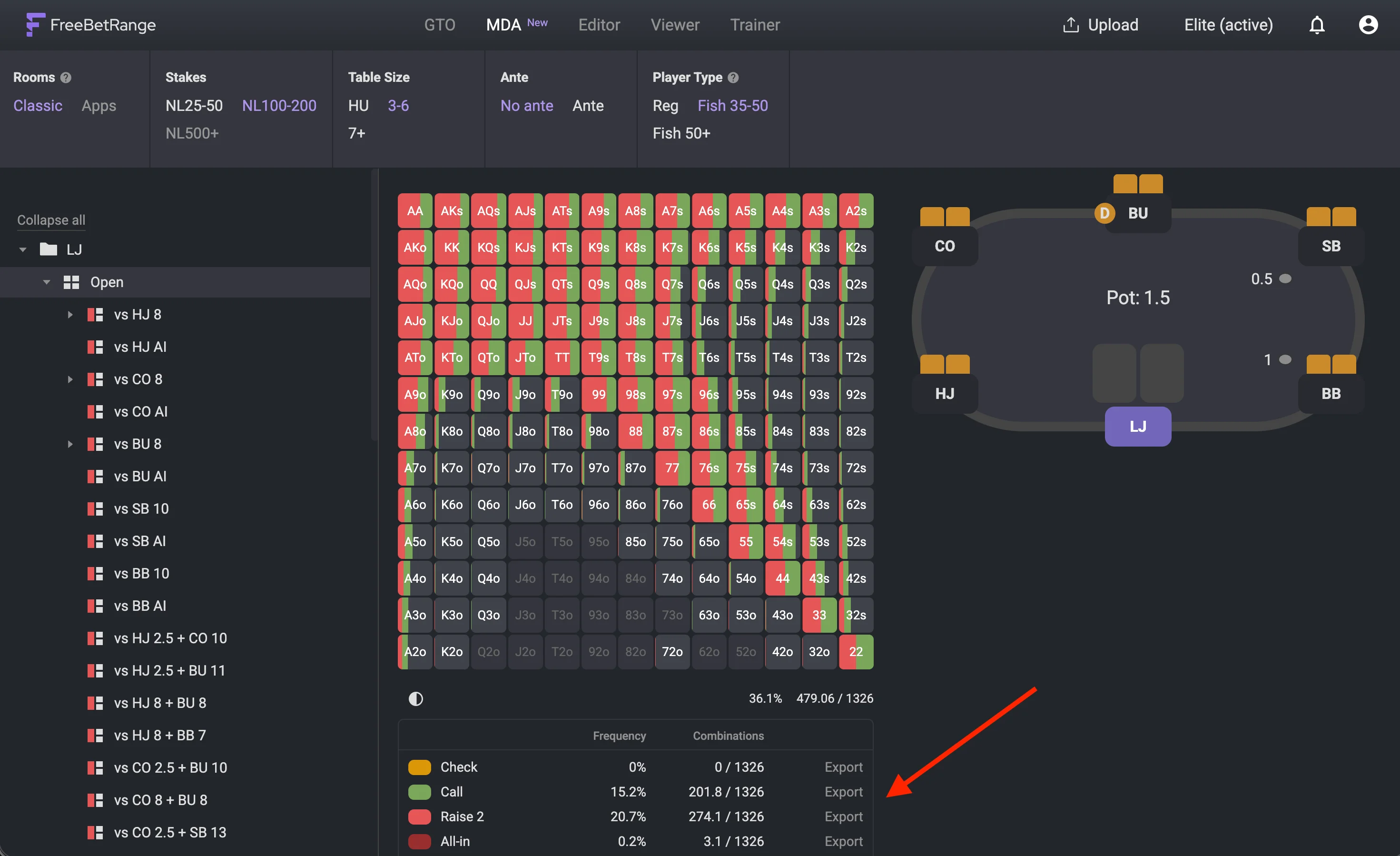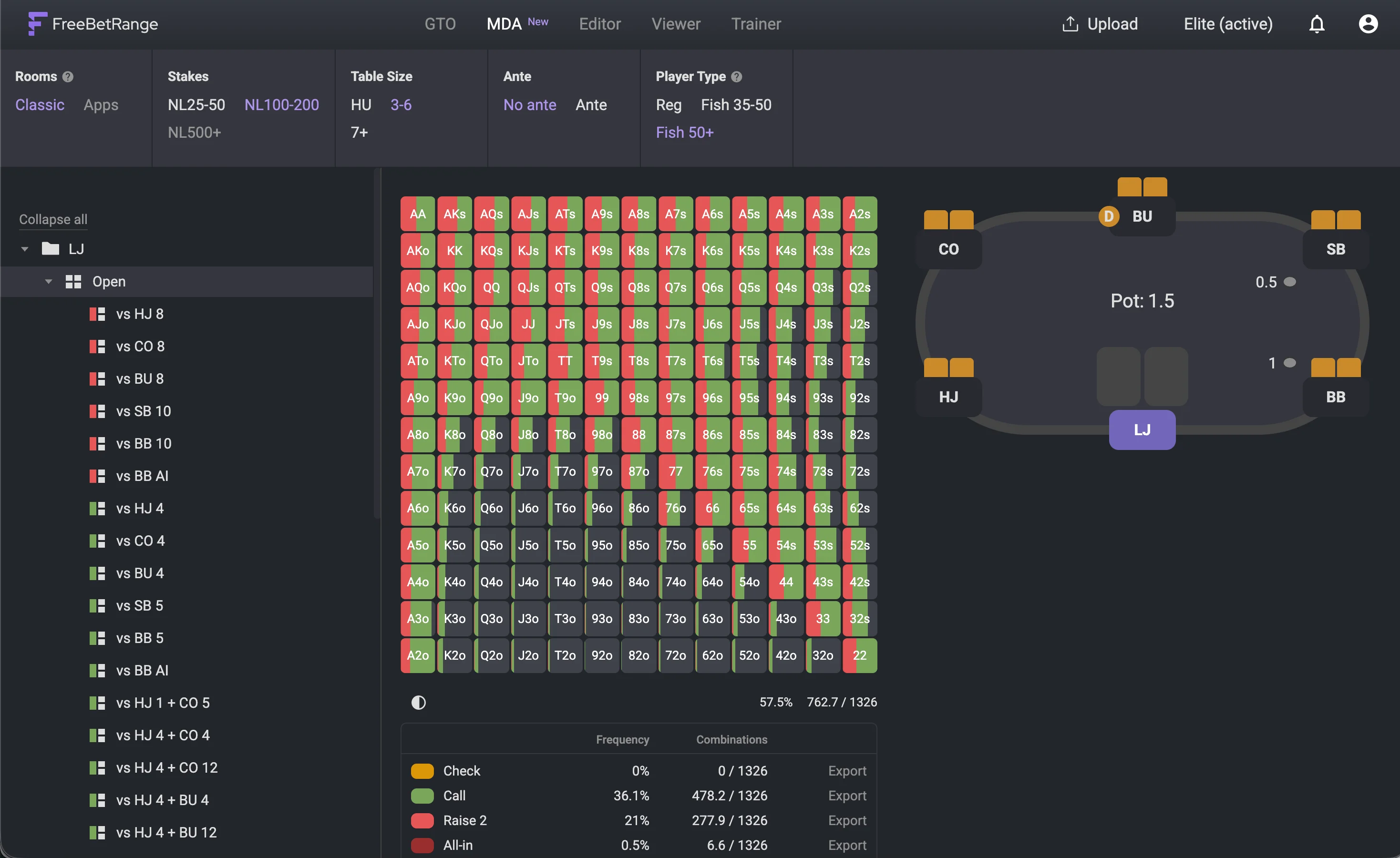 In the free version, you can explore LJ Open Raise ranges across all filters to preview the feature. Full access to MDA is available in the Elite plan.